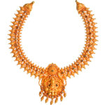 Add a touch of traditional charm to your bridal look with this majestic necklace. It features extremely detailed carvings enhanced by its stone embellished pendant. The celebratory hue of its yellow gold metal looks universally flattering against any skin tone.